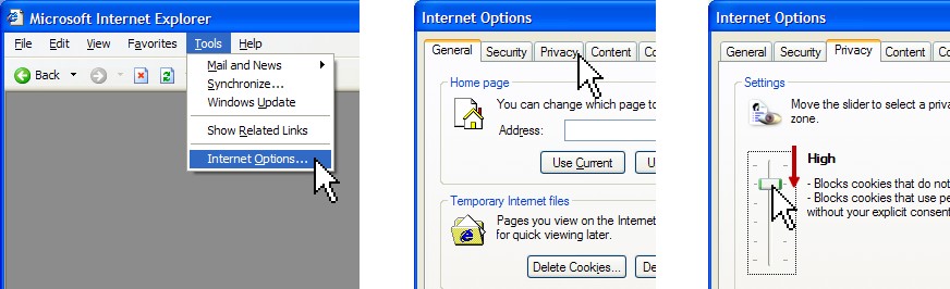 - Use the slider to change the Privacy level from 'Block All Cookies' down to 'High' (or lower), and click on 'OK'.